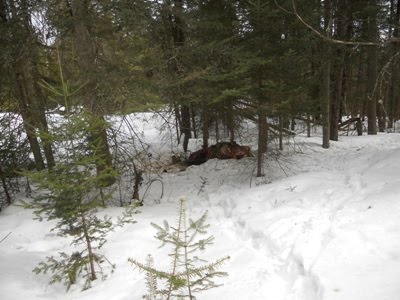 ...not long after I left the field and entered the woods, something off to the right, down over the embankment caught my eye - 'Hey - That looks like a dead moose down there!'..... I left the trail and walked down to the carcass when it occured to me that this was a fresh kill and I was in unfriendly territory, unarmed!